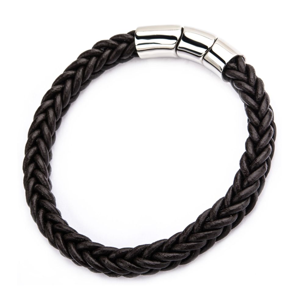 Black Leather and Stainless Steel Magnetic Clasp BraceletAdd a touch of rugged sophistication to your everyday look with the Black Leather and Stainless Steel Magnetic Clasp Bracelet. Featuring a timeless combination of genuine black leather and stainless steel, this bracelet exudes casual elegance and modern design. The smooth, textured leather band offers a comfortable and durable fit, while the sleek stainless steel magnetic clasp adds a secure, stylish closure that’s easy to put on and take off.Size 8.5"