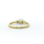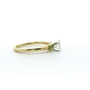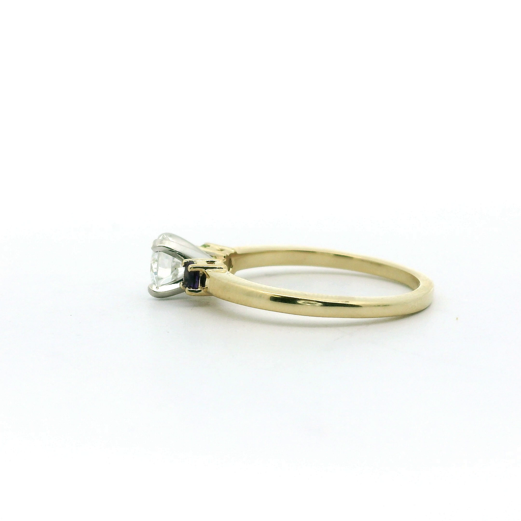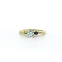 14kt yellow gold ring containing (1) 5.75mm round diamond (1) 3 mm Round Faceted AAA Natural Amethyst .10ct and (1) 3 mm Round Faceted AA Natural Arizona Peridot.13ct