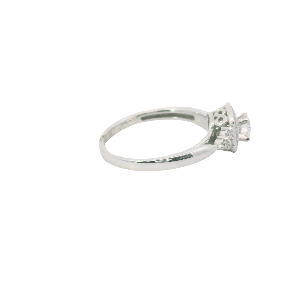 A beautiful symbol of your past, present, and future, this 3-stone halo engagement ring is crafted in polished 14 karat white gold. At its heart shines a 0.26 carat round G SI1 diamond, flanked by sparkling side stones and framed with a delicate halo of round accent diamonds totaling 0.18 carats. Designed in size 6.75, this ring offers elegant sparkle and meaningful design—perfect for a love that’s built to last.