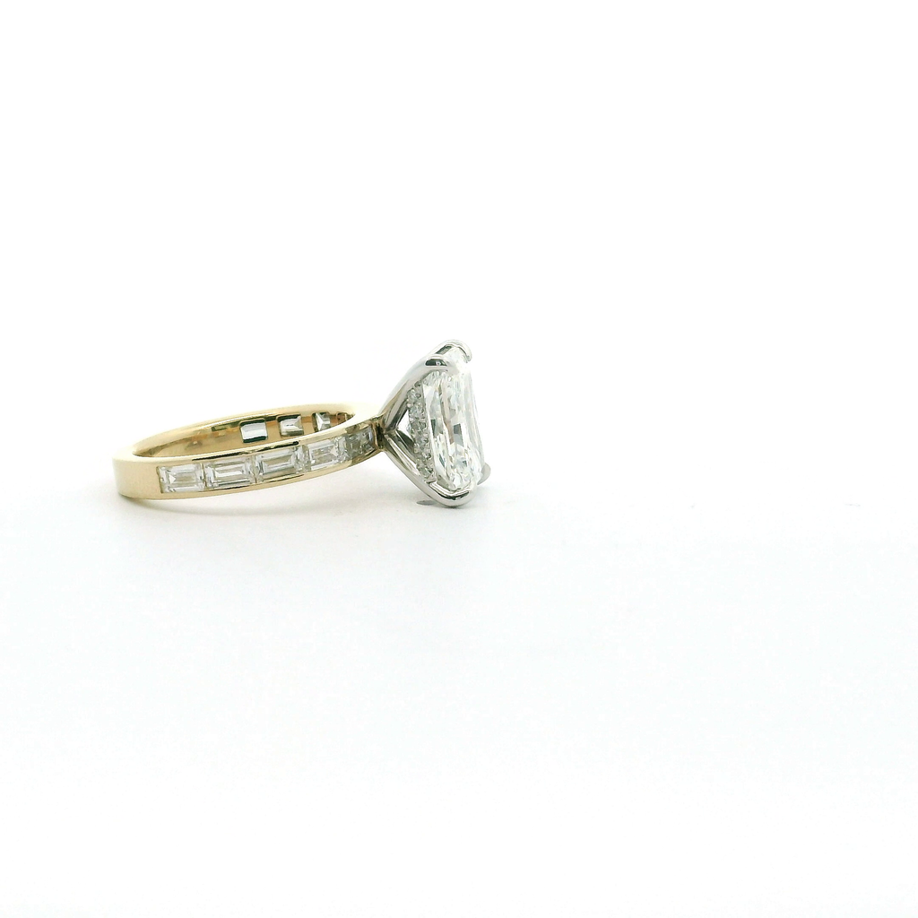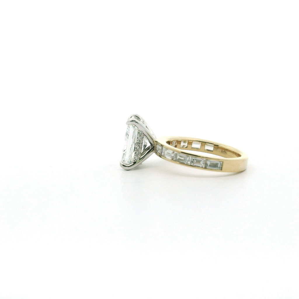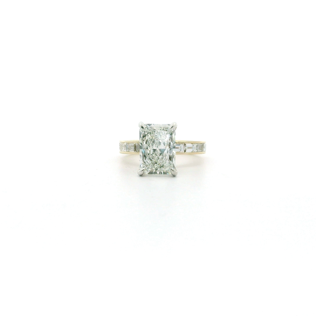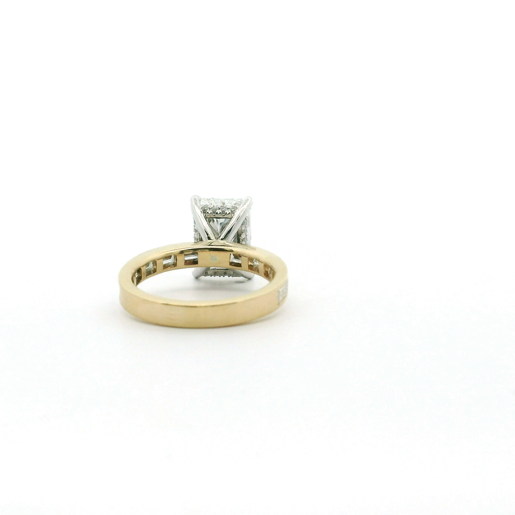 Yellow 14 Karat Lab Grown Diamond Engagement Ring containing (1) 3.57ct lab grown radiant diamond E VS2 IGI LG732551198 10.67-7.62-5.12mm and (20 1mm round lab lag grown in wite gold hidden halo head .11ctw ring also contains (10) 3.5-2.25 mm straight baguette lab grown diamonds 1.10ctw total diamond weight of 4.69ctw