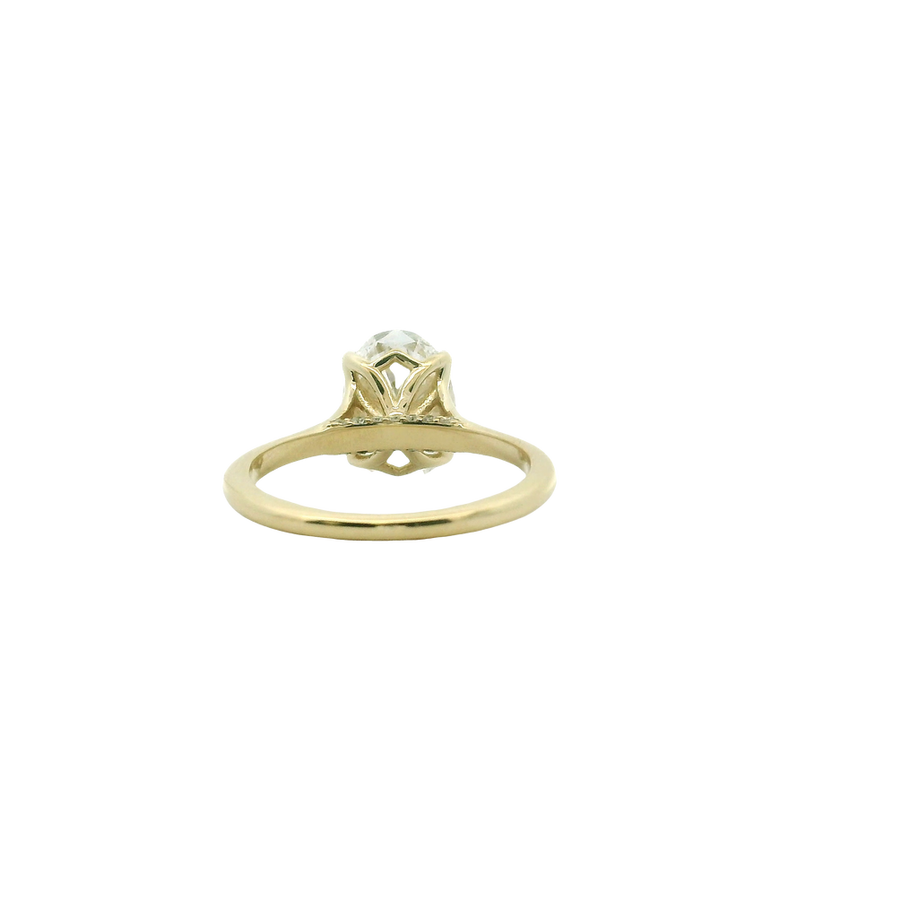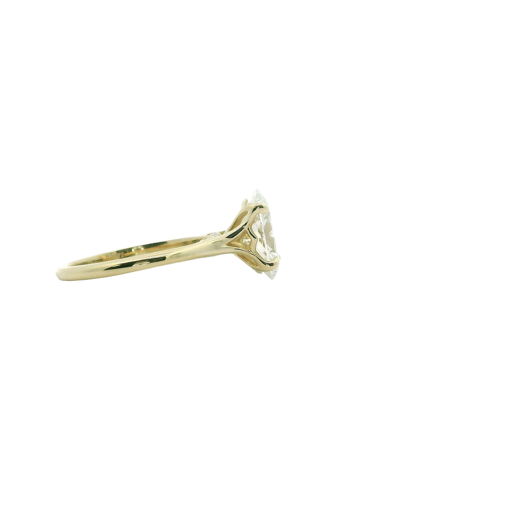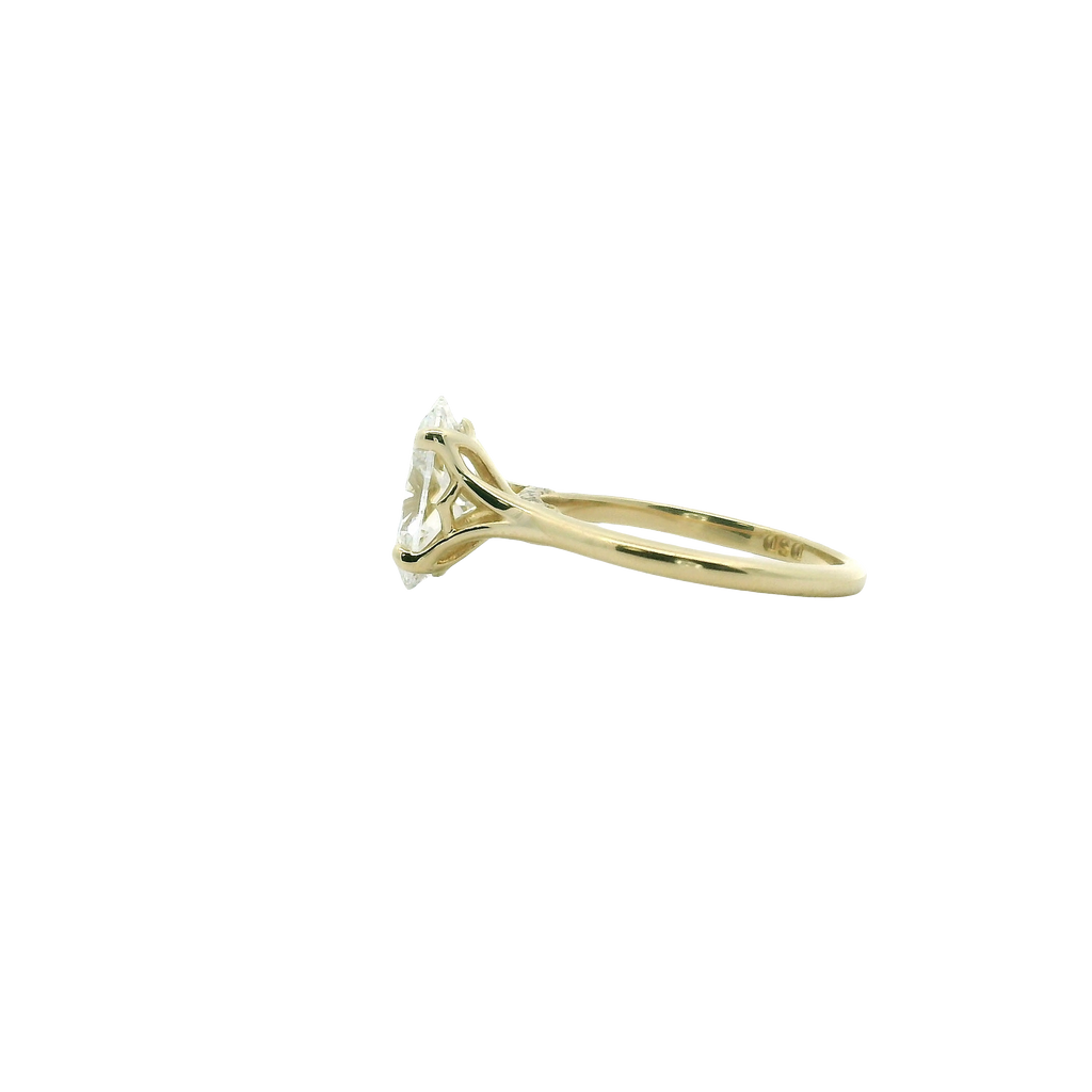 A stunning 2.56ct oval lab-grown diamond (E/VS1) takes center stage in this timeless design, accented by 16 round F/VS1 diamonds (0.06ct total). Set in polished 14K yellow gold, this ring blends modern elegance with ethical luxury — perfect for a love that lasts forever.
