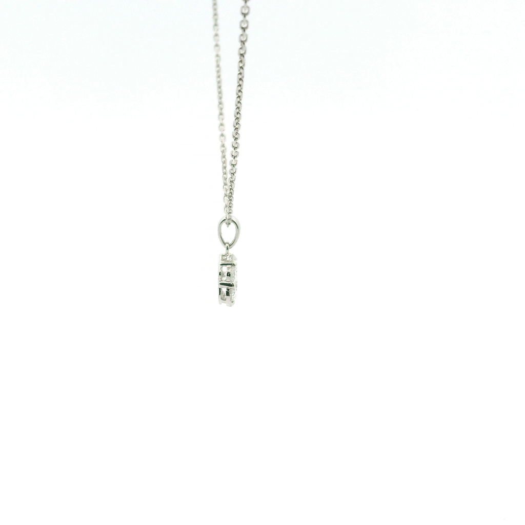 Radiating modern elegance and timeless charm, this stunning pendant features six lab-grown round brilliant diamonds—E/F color, VS1 clarity—totaling 0.58 carats. Each diamond is masterfully set in luminous 10-karat white gold, creating a captivating display of light and sophistication. Suspended from a matching 16.5-inch white gold chain, this pendant offers a refined balance of beauty and sustainability, making it the perfect expression of grace, brilliance, and conscious luxury.