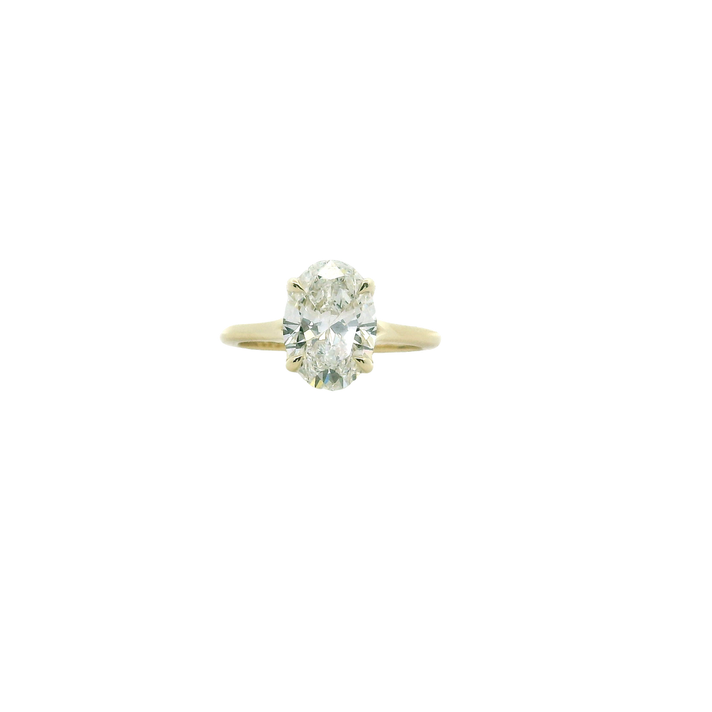 A stunning 2.56ct oval lab-grown diamond (E/VS1) takes center stage in this timeless design, accented by 16 round F/VS1 diamonds (0.06ct total). Set in polished 14K yellow gold, this ring blends modern elegance with ethical luxury — perfect for a love that lasts forever.