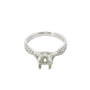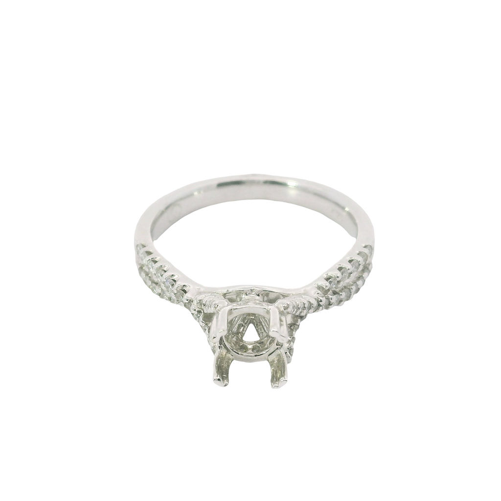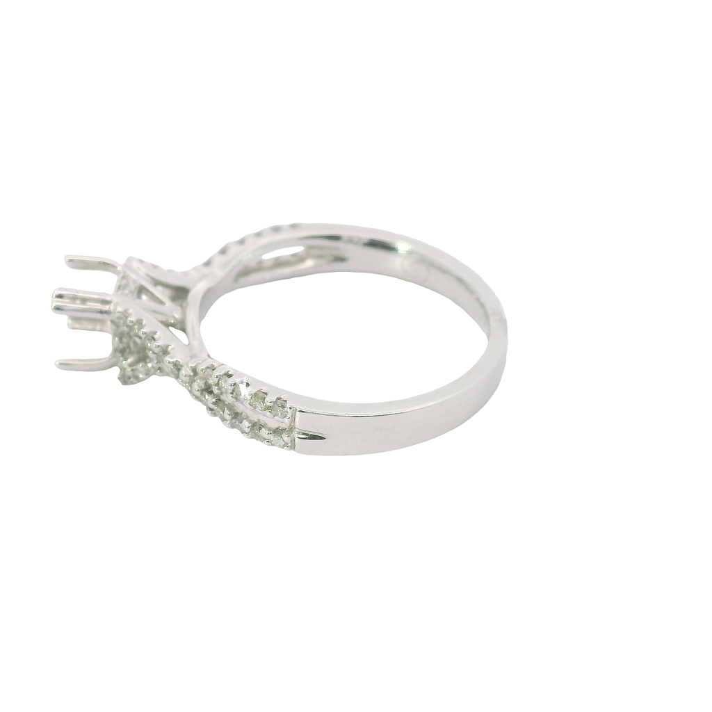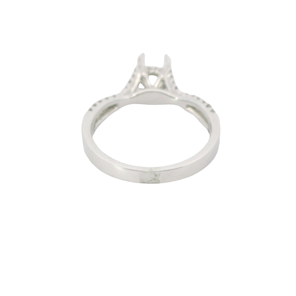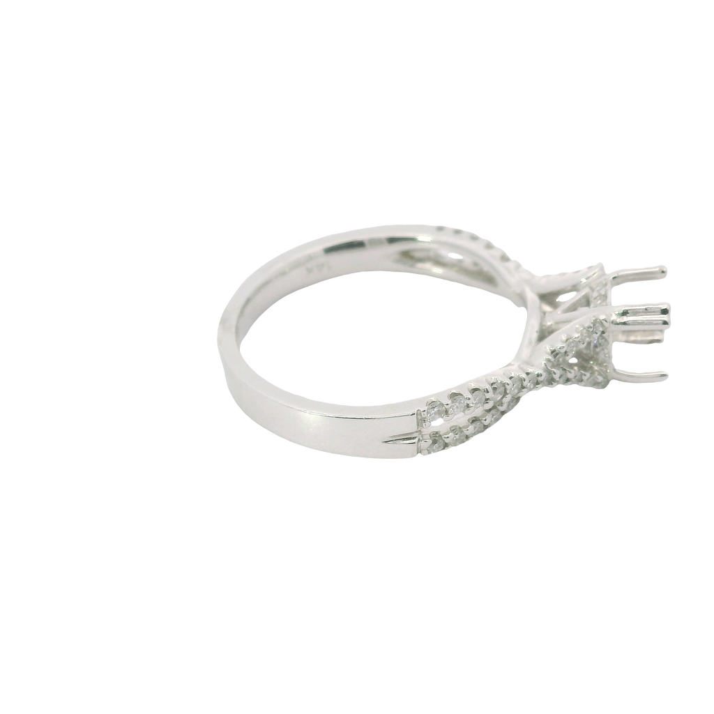 Crafted in luminous 14 karat white gold, this elegant semi-mount engagement ring features a flowing crossover design that symbolizes unity and connection. Adorned with 48 round F/G color, SI–VS clarity diamonds totaling 0.31 carats, the shimmering bands gracefully frame the setting, ready to hold the center stone of your choice. Designed in a size 6.5, this ring offers a timeless yet modern foundation for a truly personal engagement ring.