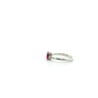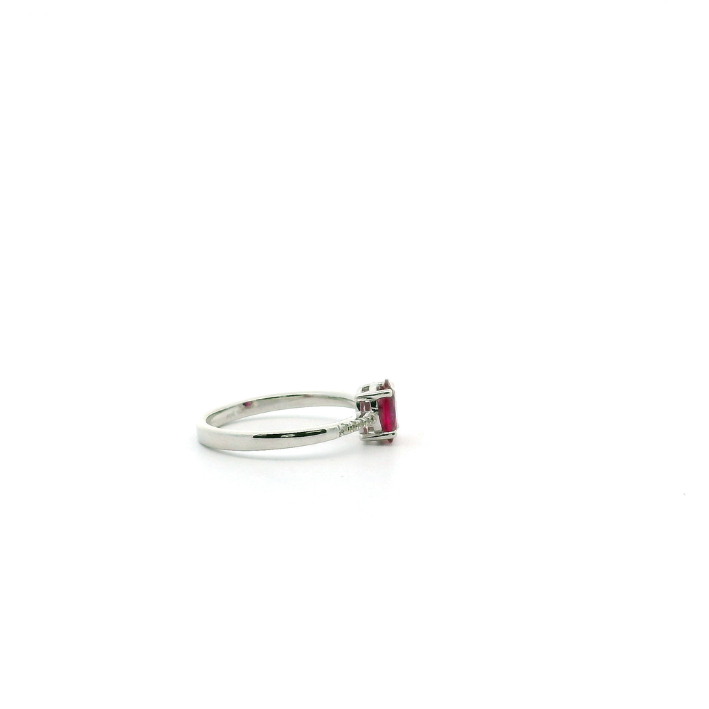 This captivating ring features a vivid 5x7mm oval-cut ruby—symbolizing love, vitality, and confidence—set in gleaming sterling silver. Five round-cut cubic zirconias delicately frame the centerpiece, adding brilliance and balance to the design without overpowering its bold, romantic hue.