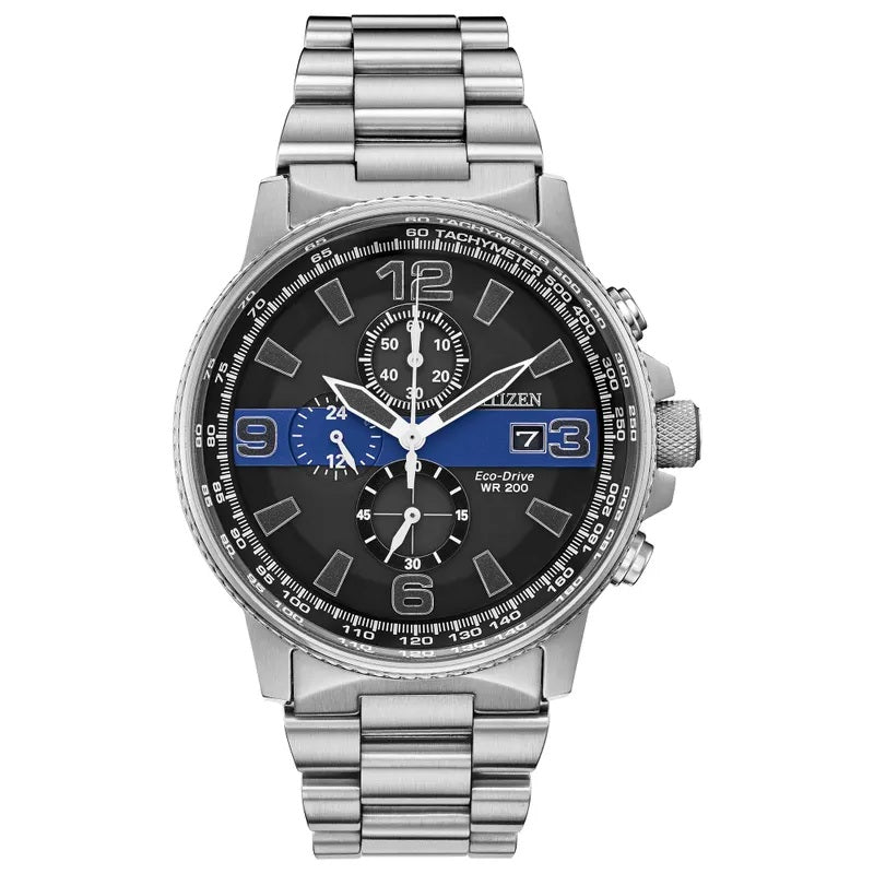 Men's Eco-Drive Chronograph Thin Blue Line Series Watch with Black Dial in Stainless Steel