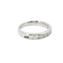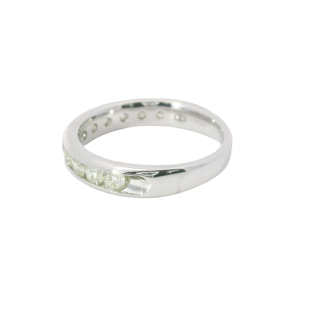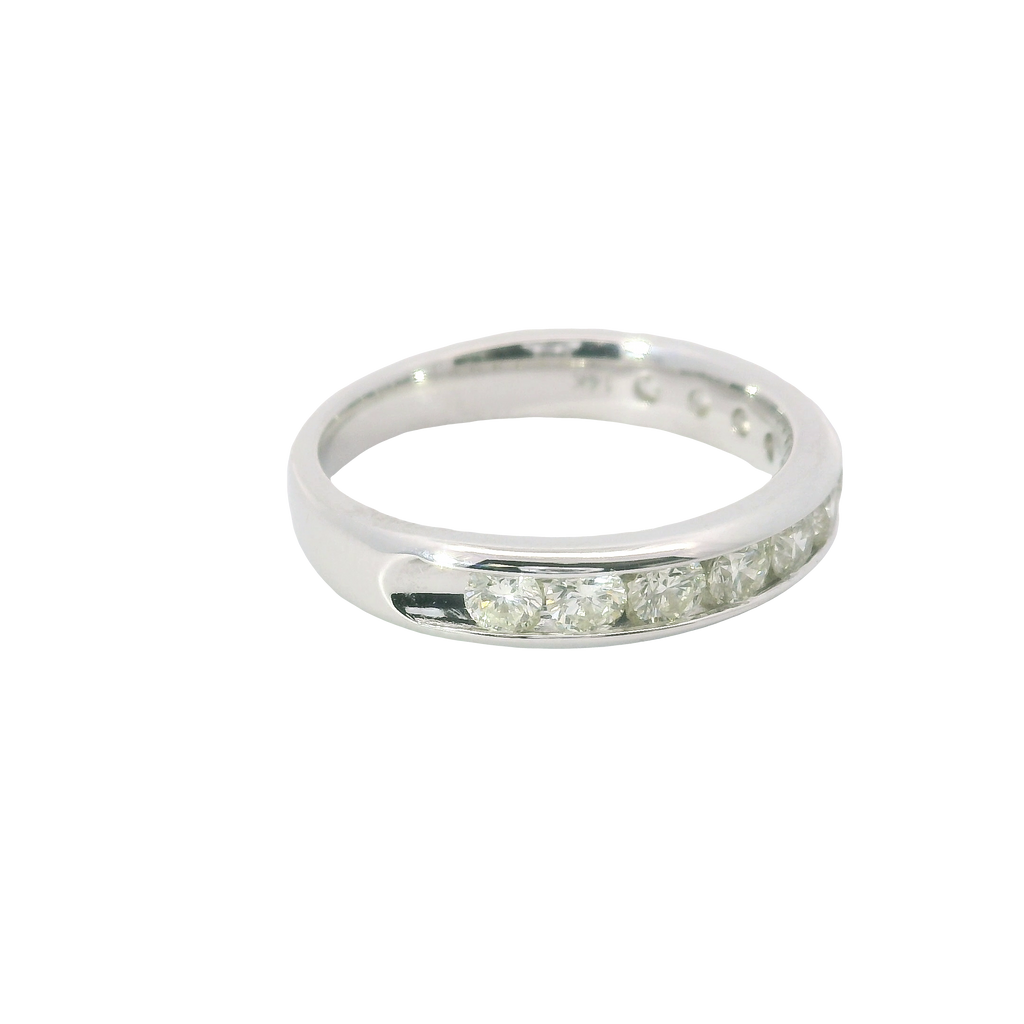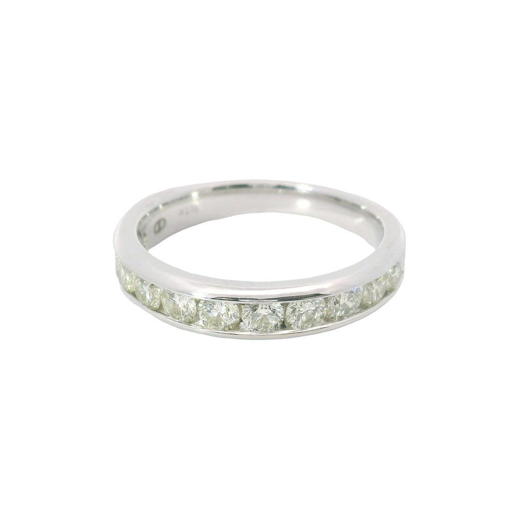 This stunning wedding band is crafted in luminous 14 karat white gold and features 11 round diamonds totaling a full 1.00 carat. Set securely in a classic channel setting, each diamond shines with exceptional brilliance while the sleek profile ensures lasting comfort and style. A timeless expression of commitment, this band is perfect worn alone or paired with an engagement ring for a look of enduring elegance.