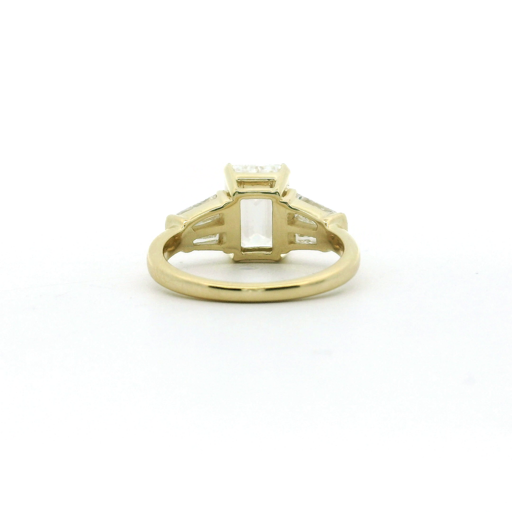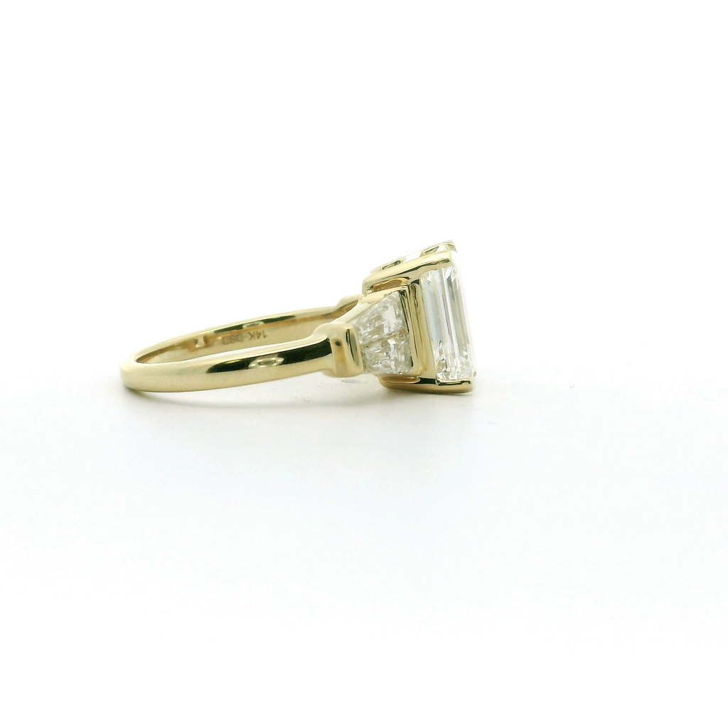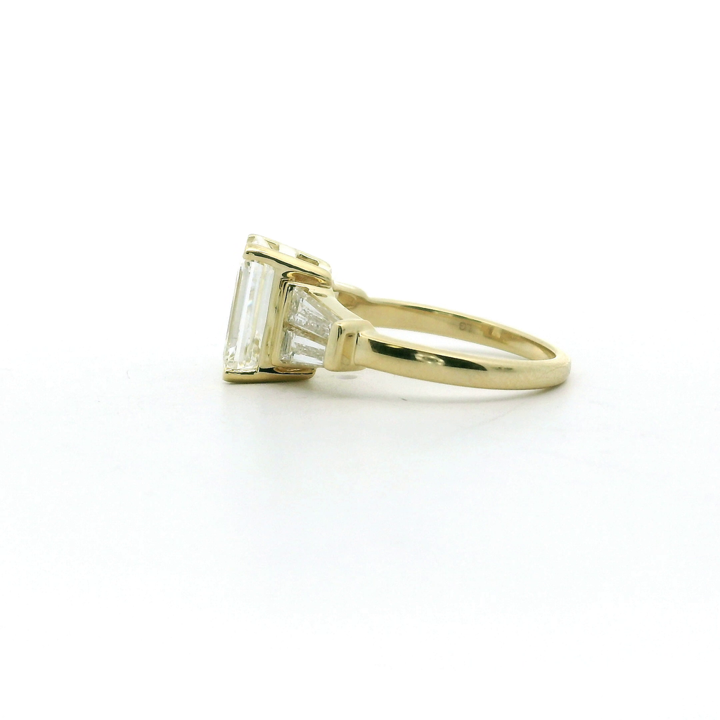 Elegant and timeless, this engagement ring is crafted in luminous 14 karat yellow gold, offering a warm, classic foundation. At its center is a stunning 3.05 carat emerald-cut lab-grown diamond, graded E color and VS1 clarity, delivering exceptional brilliance and clean, refined lines. Accented by four baguette-cut lab-grown diamonds totaling 1.00 carat (F color, VS1 clarity), the design showcases sleek symmetry and understated sophistication. Sized at 6.5 and IGI certified (LG774643722), this ring beautifully blends modern craftsmanship with enduring elegance.
