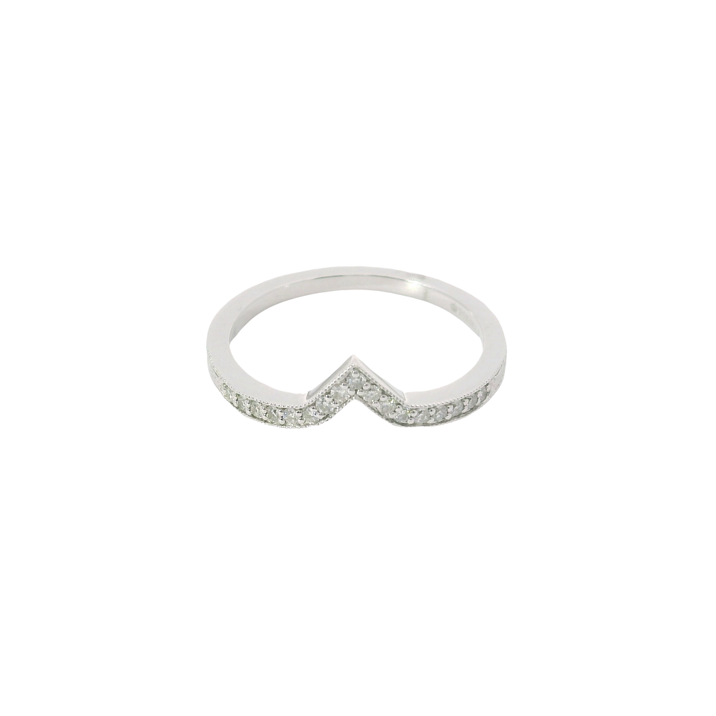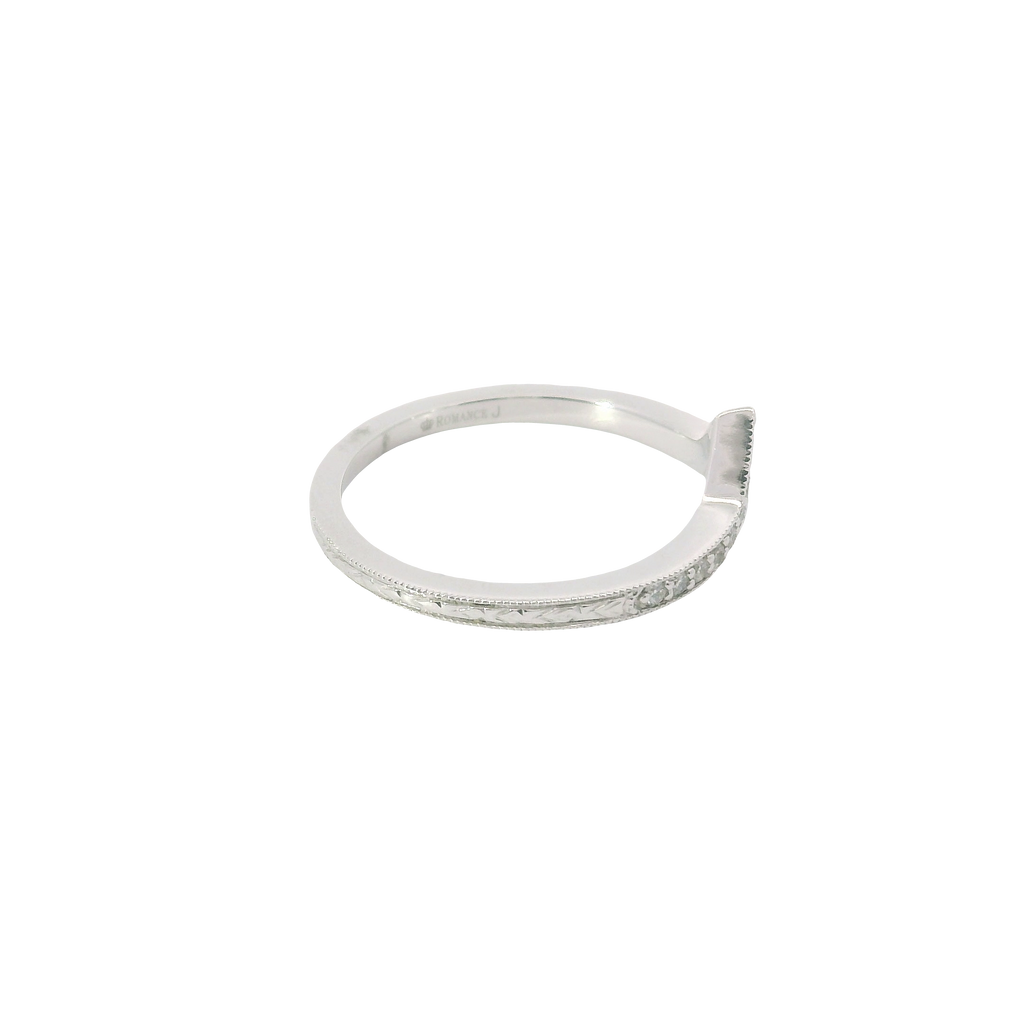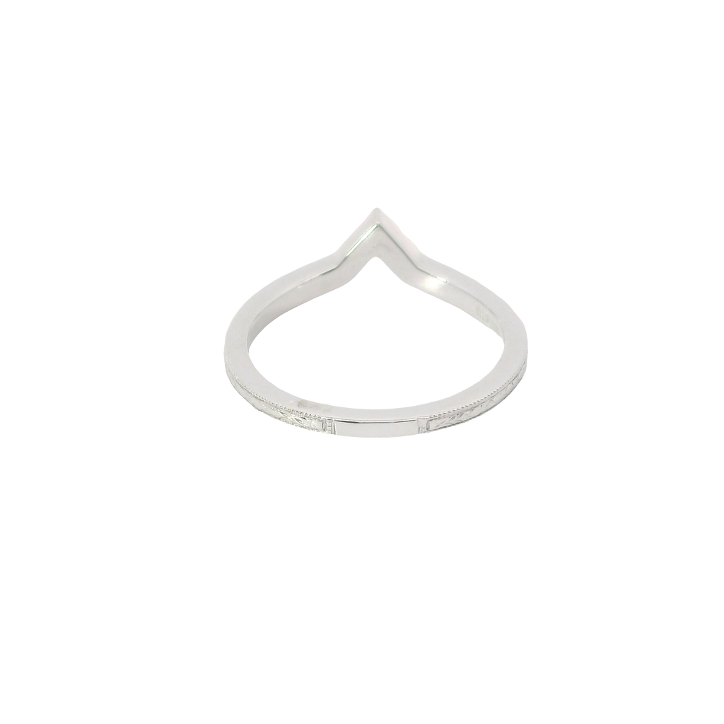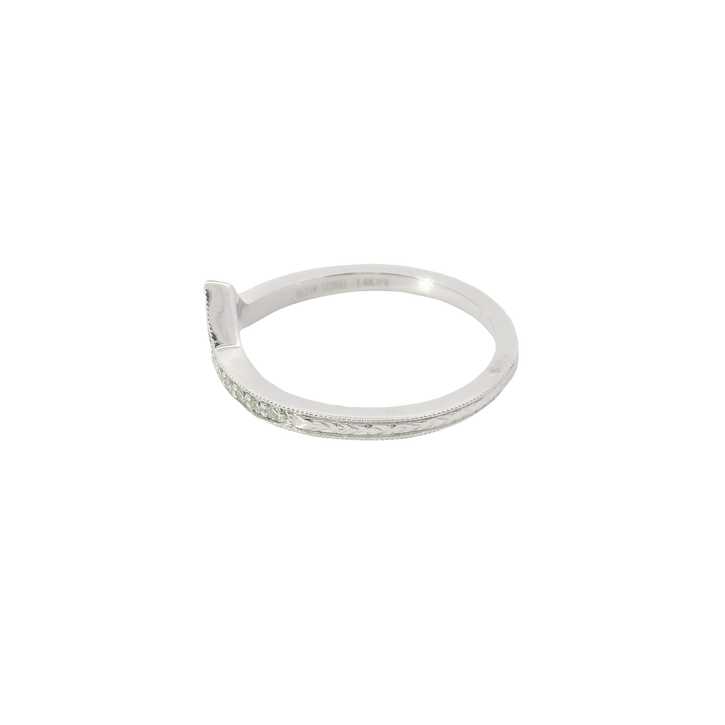 Crafted in radiant 14 karat white gold, this graceful V-shaped wedding band features a delicate line of sparkling diamonds totaling 1/8 carat, beautifully accented with intricate milgrain detailing along the edges. The contoured silhouette is perfect for pairing with an engagement ring, adding a touch of vintage-inspired elegance and refined sparkle. A timeless symbol of love with a romantic, antique charm.